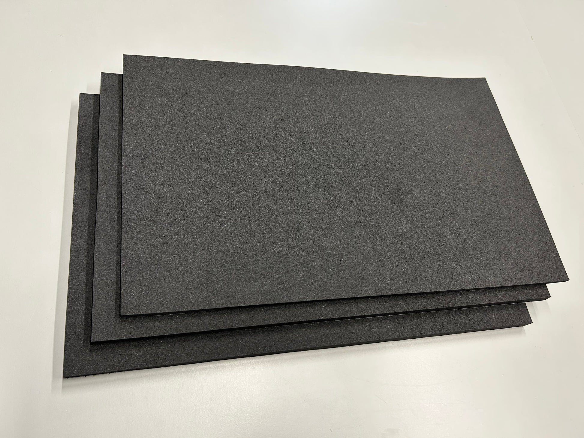 - Three 10” X 16” sheets of impact absorbing, black, low-density Neoprene with peel and stick adhesive